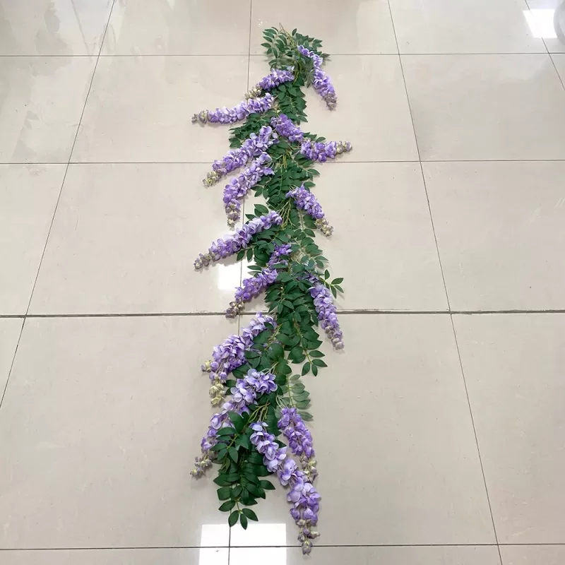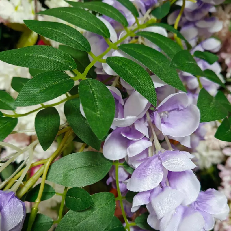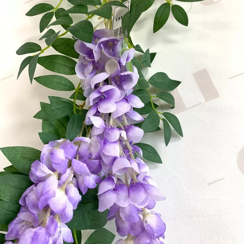 Esta falsa vid de glicinia tiene un MOQ de solo 50 piezas y admite pedidos de color mixto y estilo mixto, que es especialmente adecuado para minoristas, compañías de bodas o compras de eventos a gran escala.