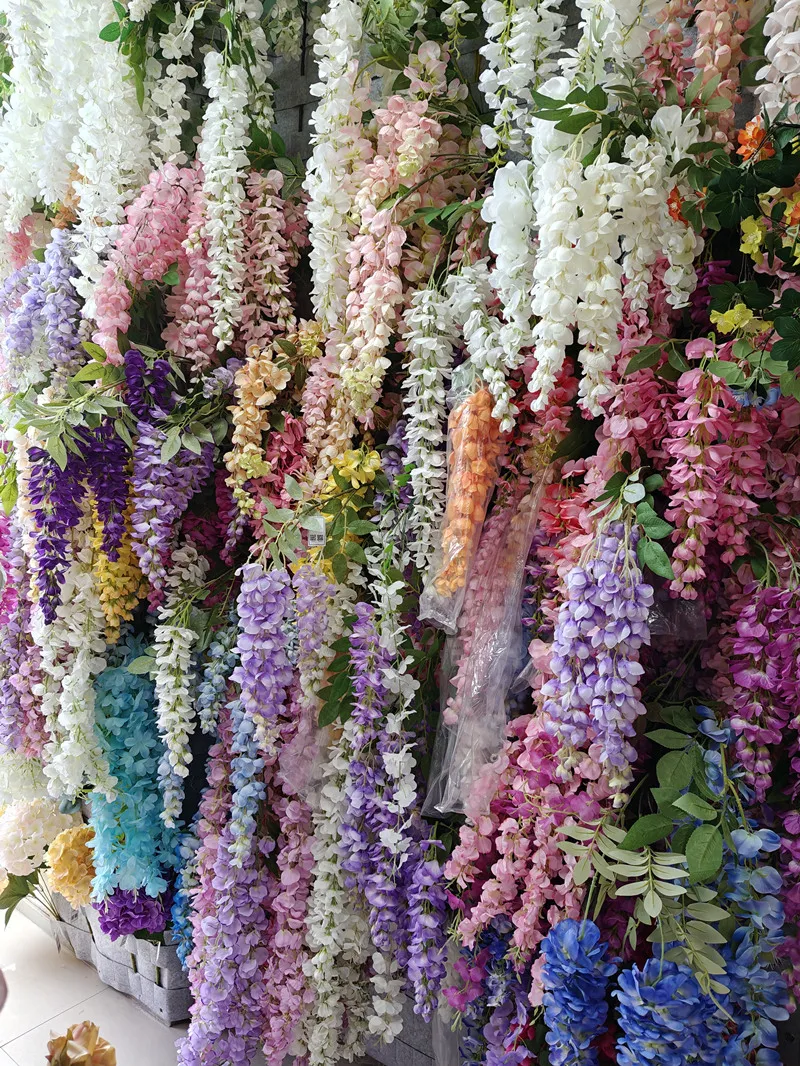Glicinia artificial Área, actualmente tenemos una variedad de especificaciones y colores de las glicinias artificiales, los productos actuales en los estantes son: