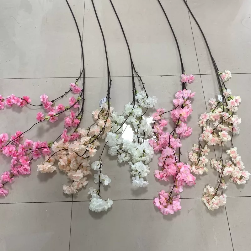 Las ramas artificiales de la flor de cerezo cuentan con tres capas de pétalos de seda, estambres rosados, ramas de cinco ramificadas y cuatro juegos de hojas verdes. Con aproximadamente 63 cm (aproximadamente 2 pulgadas) de altura, es adecuado para una variedad de entornos, incluidos los arreglos para la decoración del hogar y la boda.