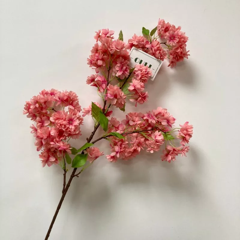 Esta rama artificial de la flor de cerezo presenta múltiples horquillas de flores y cuatro conjuntos de hojas verdes, creando una capas armoniosas y ricas.